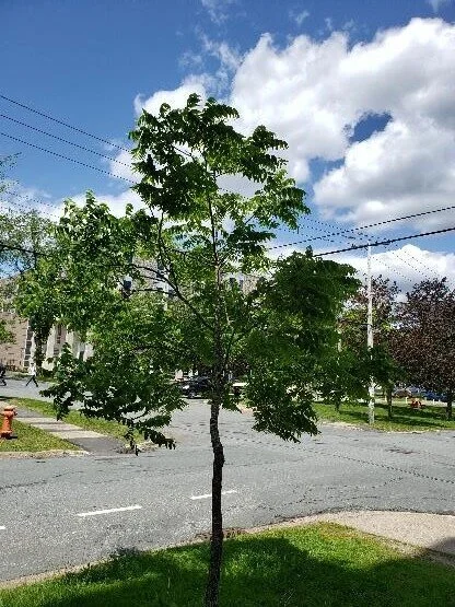 One wouldn’t want to be a tree competing for space close to a black walnut! They are allelopathic, which means that they release a chemical known as juglone from their roots to prevent other plants and trees from growing there and stealing their precious resources. Similar to the well-known red and silver maples, black walnut is a pioneer species and is considered a common weed in some areas of its native range. In addition to its trusty juglone, it is fast-growing and enlists the help of squirrels and other rodents for seed dispersal – you may have noticed red squirrels burying (and maybe even forgetting?) nuts in the ground for a quick snack at a later time. As a planted ornamental species along streets, walnuts provide much-needed canopy and shade during sunnier, warmer months, with a round crown shape that can spread quite wide if given the space. Black walnut may find itself right at home in Halifax, where familiar trees from its native range are also planted in the streets, such as tulip tree (Liriodendron tulipifera), basswood (Tilia americana), sugar maple (Acer saccharum) and oak (Quercus spp.).
